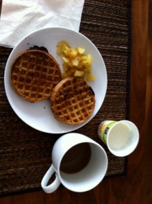 I decided to go for the frozen waffles at Wholefoods. They do not have so much taste but with a little butter and honey it’s actually okay. I cut some apples and cooked them in a pot for a few minutes (add three spoons of water, honey and cinnamon)