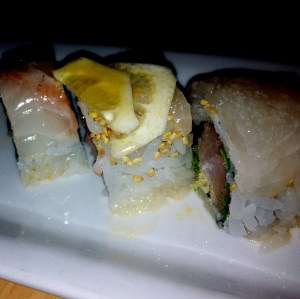 Shiso Lemon Roll Yellowtail, green onions and tempura shiso leaf inside, with thin slices of Halibut, and lemon on top with yuzu juice, chili oil, and salt  19.00